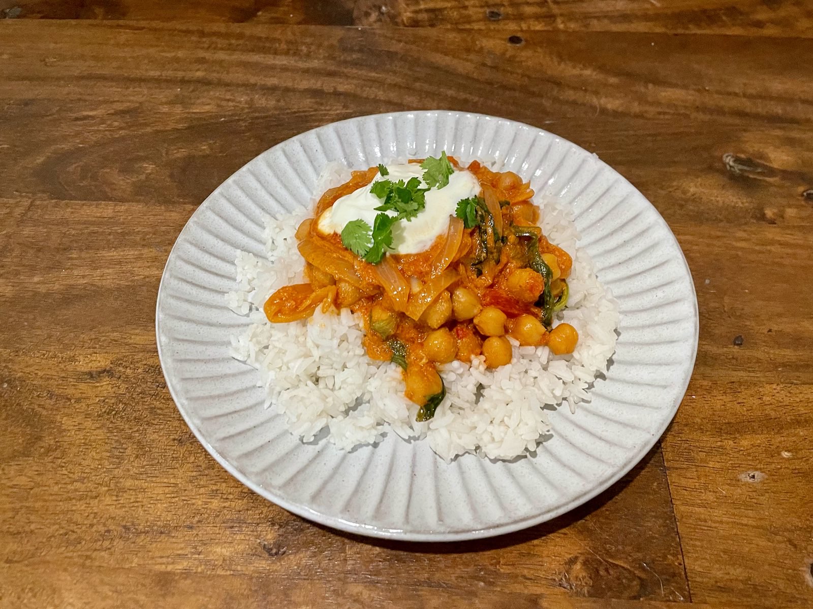 This is a relatively simple curry that gives more of a flavour bomb than you would expect! Healthy and filling because of the chickpeas, spicy from the paprika, cumin and then with the addition of cayenne pepper for a bit of a kick. Add a dollop of your fave yoghurt and a squeeze of lime juice to round it out. Served on a bed of rice to make it a full meal.